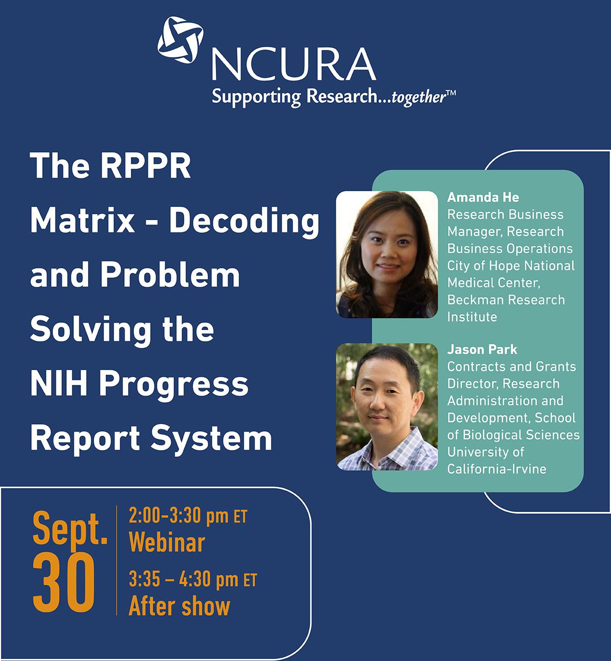 The Office of Research is providing access to the Live Virtual NCURA Workshop – The RPPR Matrix – Decoding and Problem Solving the NIH Progress Report System featuring our own, Jason Park, to the campus community free of charge. This live webinar will be held on Monday, September 30th, at 11:00 AM (PDT). To register, you will need to click on the unique link below. Please do not share this link with anyone outside of the UC Irvine community. You must use your uci.edu email address to register, or your registration may be cancelled by NCURA. If your NCURA account is set up with your personal email address, you’ll need to set up a free account using your uci.edu email (you can do so by clicking here to create a new profile).