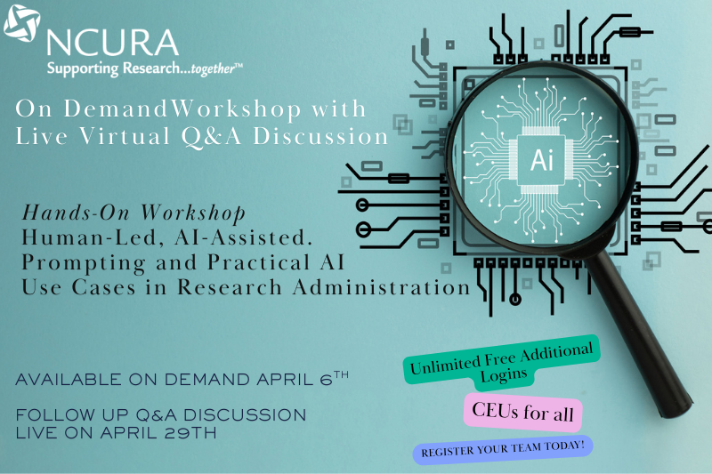 - The recording of “Human-Led, AI-Assisted: A Hands-On Workshop on Prompting and Practical AI Use Cases in Research Administration” is available as of April 6, 2026.