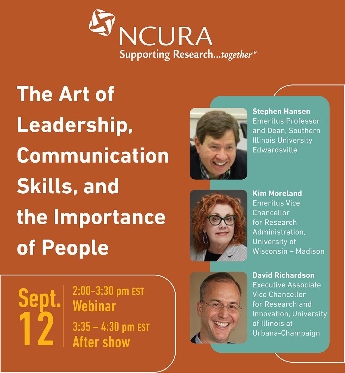 The Office of Research is providing access to the Live Virtual NCURA Workshop – The Art of Leadership, Communication Skills, and the Importance of People to the campus community free of charge. This live webinar will be held on Thursday, September 12th, at 11:00 AM (PDT). To register, you will need to click on the unique link below. Please do not share this link with anyone outside of the UC Irvine community. You must use your uci.edu email address to register, or your registration may be cancelled by NCURA. If your NCURA account is set up with your personal email address, you’ll need to set up a free account using your uci.edu email (you can do so by clicking here to create a new profile).