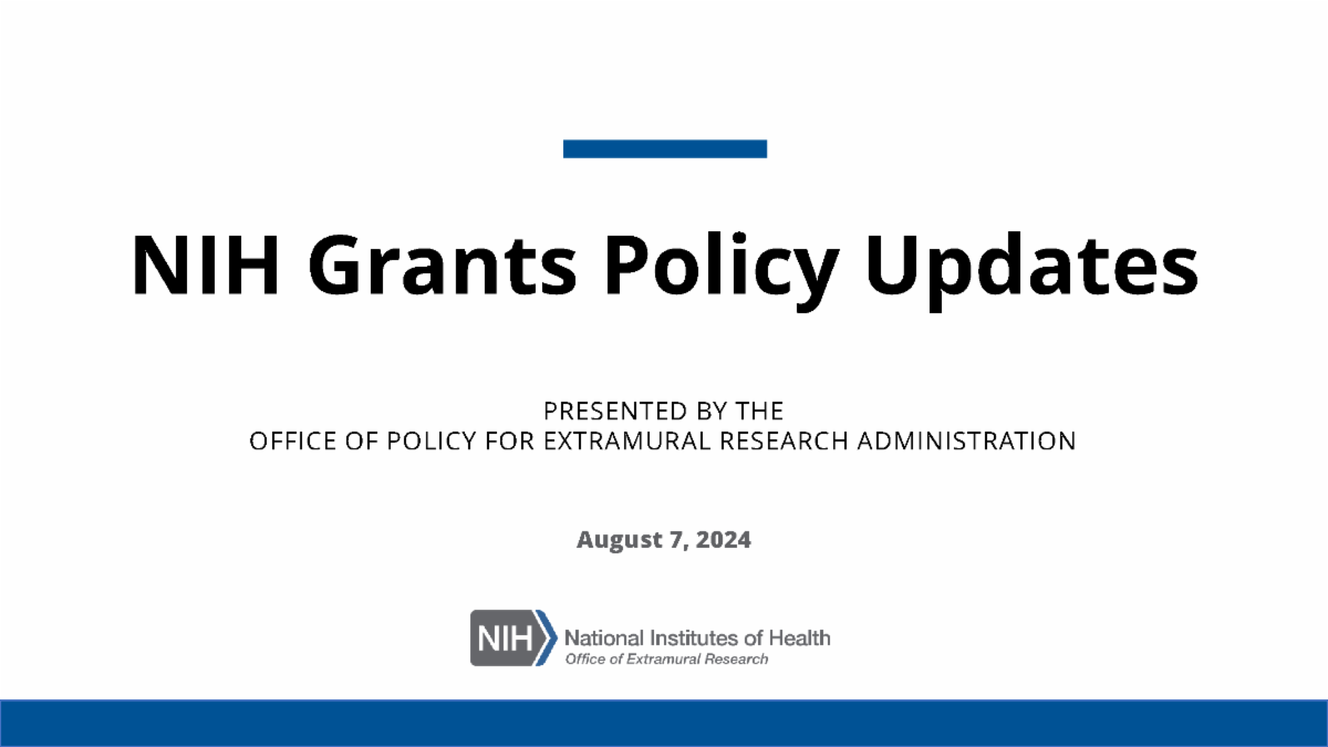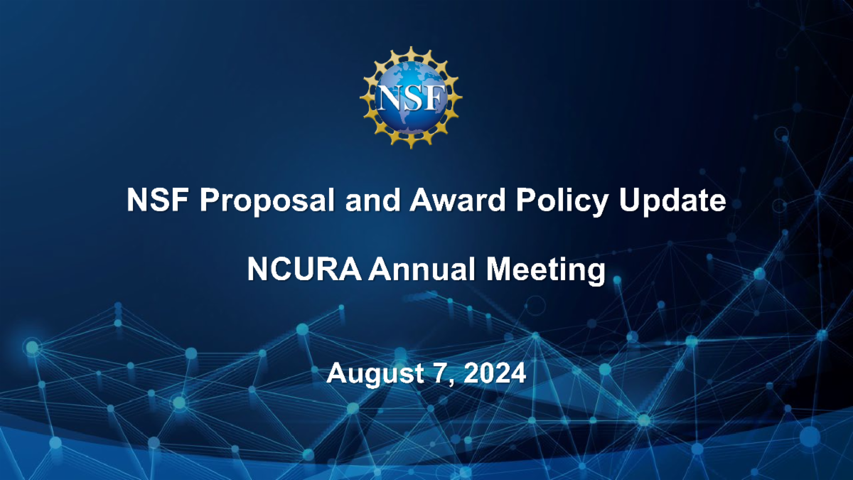 Watch Now: NIH & NSF Updates – Recorded at the 66th Annual Meeting / Contract and Grant News / October 3, 2024 NIH & NSF Updates Recorded at the NCURA 66th Annual Meeting August 17-19, 2022 NIH Update Recorded August 7, 2024 Ft. Kasima Garst, NIH Office of Policy for Extramural Research Administration (OPERA) Video & Slides NSF Update Recorded August 7, 2024 Ft. Jean Feldman, NSF Policy Office Video & Slides NCURA | 1015 18th Street NW, Suite 901 | Washington, DC 20036 US