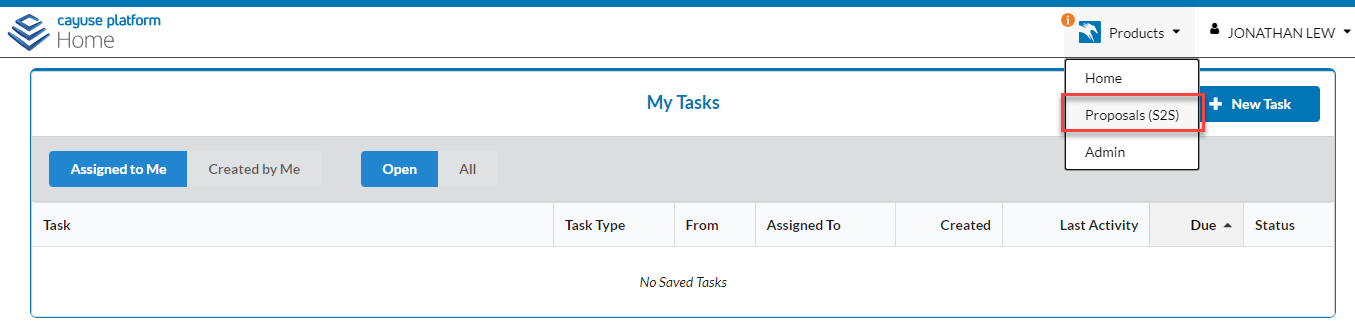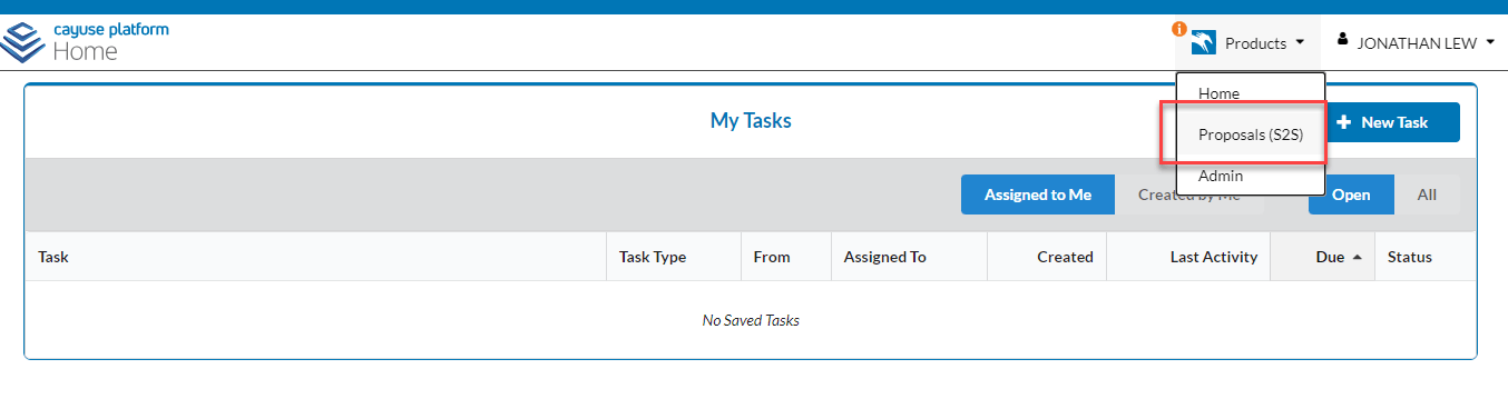 To get to the Proposals module, you will need to click Products in the upper right corner, and then select Proposals (S2S):